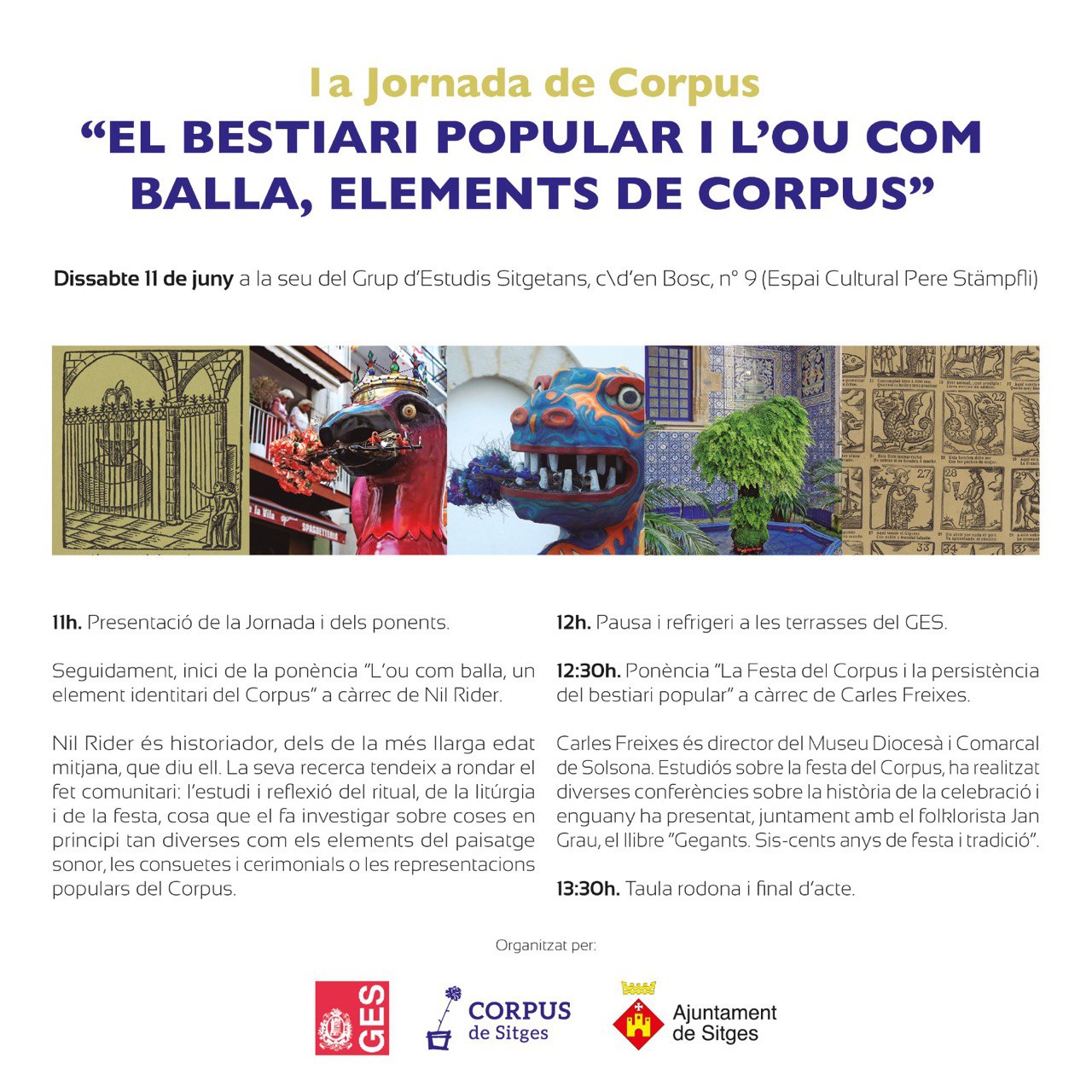 Aquest dissabte 11 de juny, a la seu del Grup d’Estudis Sitgetans (GES) se celebrarà 1a Jornada de Corpus: “El bestiari popular i l’ou com balla, elements de Corpus”, coorganitzada pel Grup d’Estudis Sitgetans i la Comissió del Corpus de Sitges.