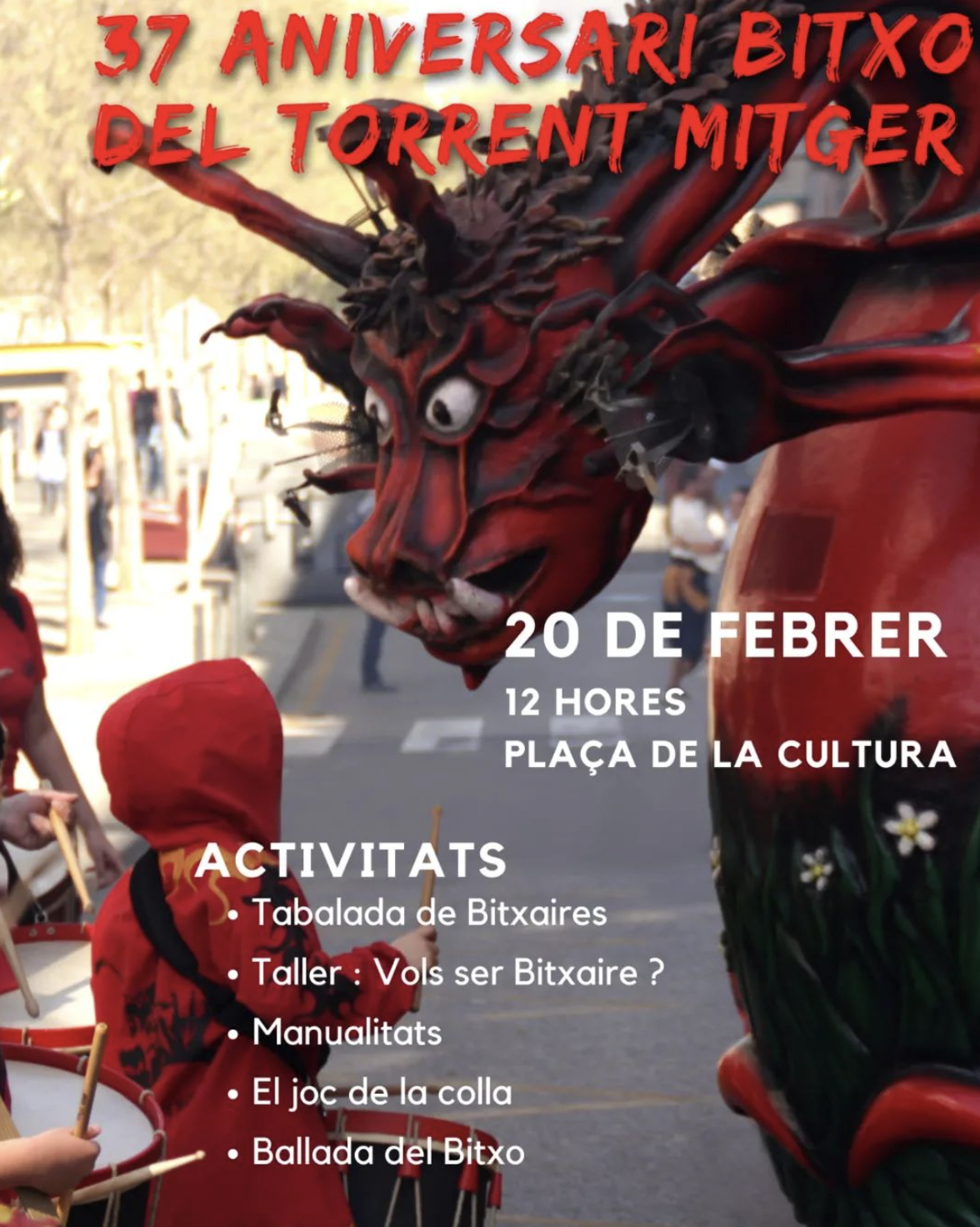 El pròxim diumenge 20 de febrer, la colla del Bitxo del Torrent Mitger ha preparat diferents activitats per celebrar el 37è aniversari de la figura. A les 12 del migdia, a la plaça de la Cultura de Terrassa, es farà una tabalada, així com diferents manualitats i jocs oberts a tothom.