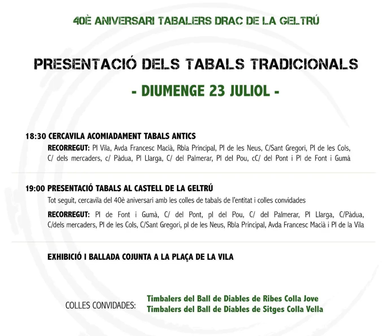 Tot seguit, cercavila amb les tres colles de tabals de la colla (Bessons, Drac petit i Drac gran) i com a colles convidades els tabalers de la @collajoveribes i dels @diablesdesitges_collavella. Des del Castell a la plaça de la Vila.