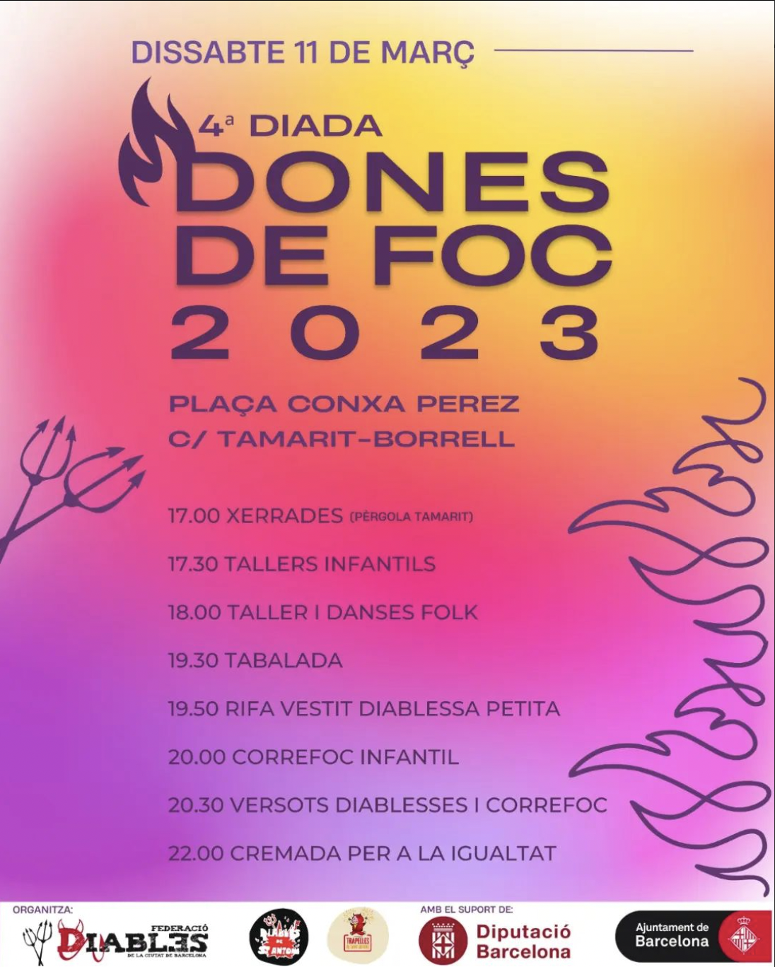 El pròxim dissabte 11 de març, amb motiu del Dia Internacional de les Dones (8 de març), se celebrarà la 4a edició de la Diada Dones de Foc. Des de les cinc de la tarda fins a les deu de la nit, a la plaça de Conxa Pérez del barri de Sant Antoni, es faran tallers, xerrades, una tabalada i fins i tot una lectura de versots i dos correfocs, així com una cremada per a la igualtat.