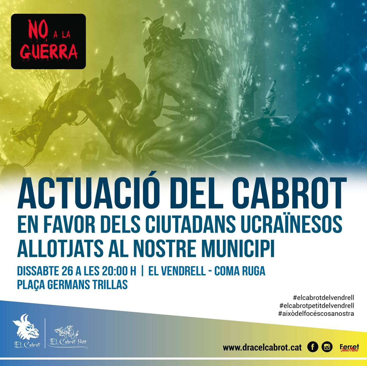 Dissabte 26 de març, a les 20 h, El Cabrot del Vendrell, el Cabrot Petit, les maces i la batucada faran una actuació a Coma Ruga per donar tot l’escalf possible als ciutadans ucraïnesos que estan allotjats al municipi. Ara més que mai, cal estar units en el “NO a la Guerra”! Autor del cartell: Joan Marc Ferret.