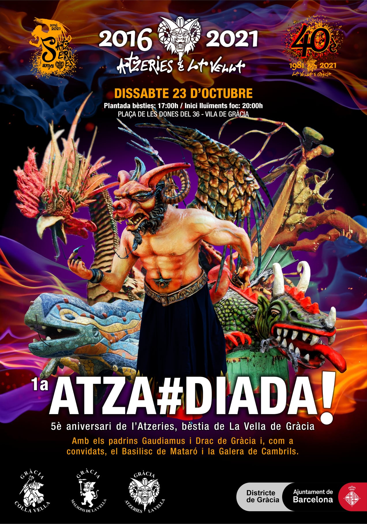 Dissabte 23 Octubre, a la plaça de les Dones del 36 del barri de Gràcia, es farà la celebració dels cinc anys d’història de l’Atzeries amb els padrins Gaudiamus i Drac de Gràcia i, com a convidats, el Basilisc de Mataró i la Galera de Foc de Cambrils.
