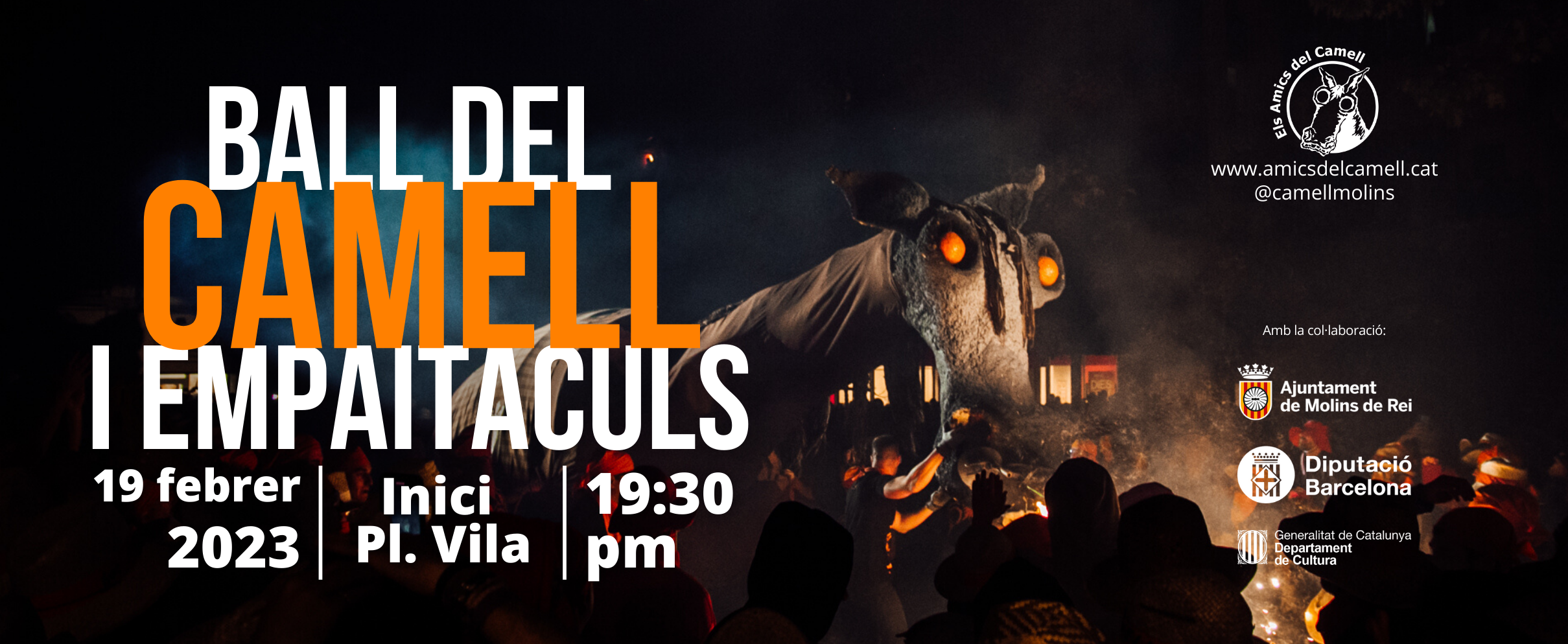 - 19:30h Ball del Camell (Conjuntament amb l’Esbart Dansaire, els Grallers de Molins de Rei i el Comitè de l’Antifaç)