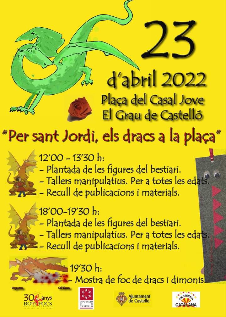 El pròxim dissabte 23 d’abril, l’associació Botafocs Ball de Dimonis i Bestiari de Castelló celebrarà la Diada de Sant Jordi al barri del Grau. Durant tot el dia es faran diferents activitats a la plaça del Casal Jove. Aquestes són: