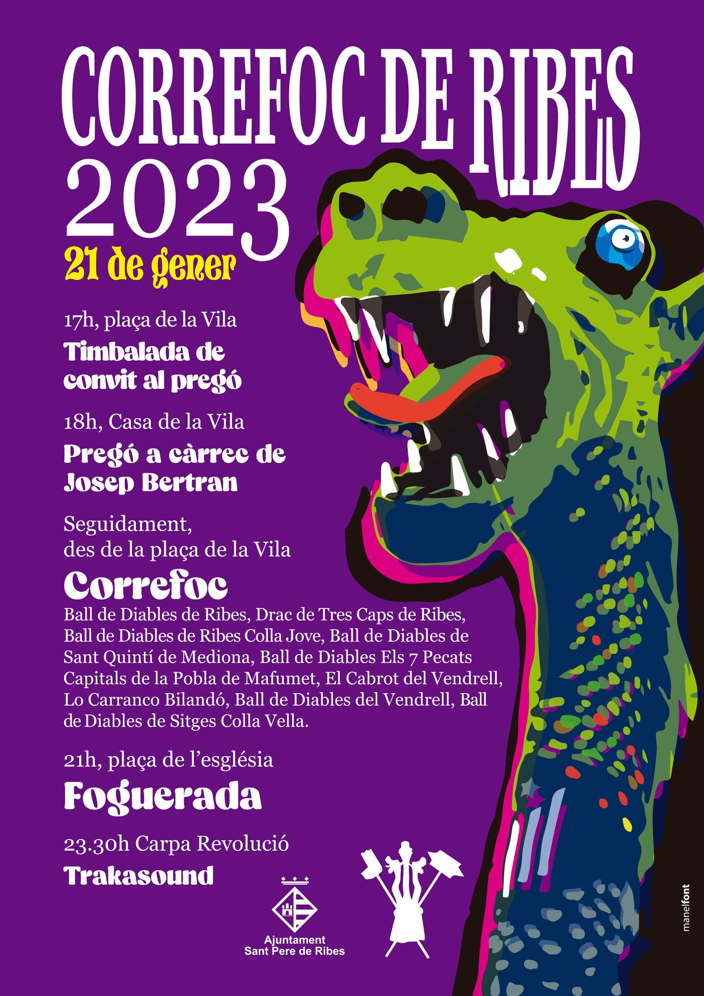 El Drac de Tres Caps de Ribes, lo Carranco Bilandó de Cervera i el Cabrot del Vendrell participaran el pròxim dissabte 21 de gener a un correfoc a Ribes. L’acte es farà amb motiu de les festes de Sant Pau i a part del correfoc també es farà: timbalada de convit al pregó, pregó a càrrec de Josep Bertran, foguerada i actuació musical amb Trakasound.