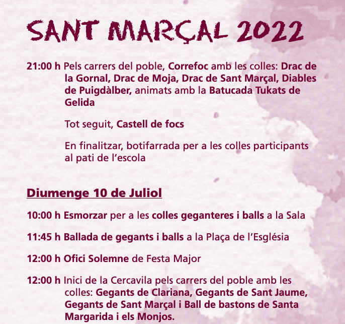 El Drac de la Gornal, el Drac de Moja, el Drac de Sant Marçal i els Diables de Puigdàlber participaran dissabte en un correfoc de Festa Major animats per la Batucada Tukats de Gelida. L’acte començarà a les 21 h i el recorregut passarà pels principals carrers de Castellet i la Gornal. En acabar, es farà un Castell de focs.