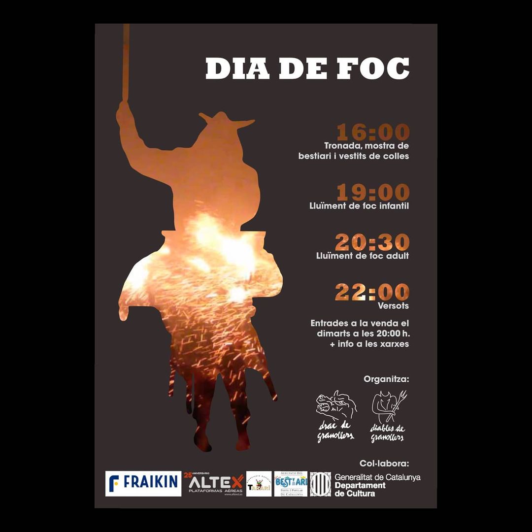 El pròxim dissabte 17 d’octubre a partir de les 16 h al Parc de Ponent de Granollers tindrà lloc el Dia del Foc. Durant la jornada es farà una mostra de bestiari de foc, diferents enceses de lluïment i també hi haurà versots a càrrec dels Diables de Granollers.