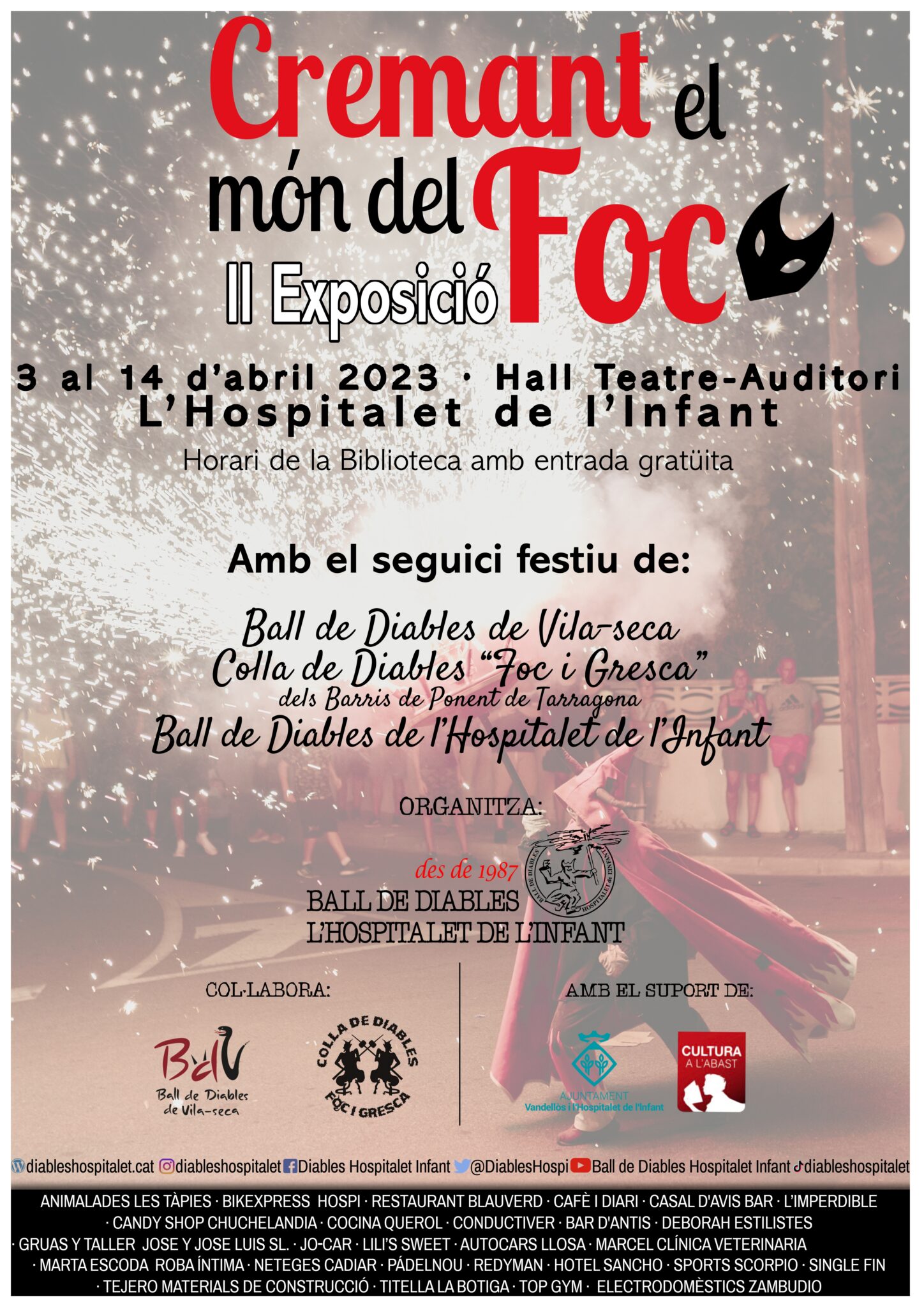 El Ball de Diables de l’Hospitalet de l’Infant ha organitzat per aquest mes d’abril la segona edició de l’exposició ‘Cremant el món del foc!’. Enguany els visitants es podran tornar a endinsar en la història del món del foc i descobrir les curiositats que formen part dels correfocs.