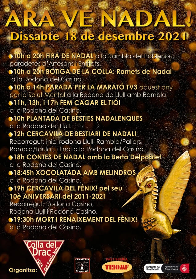 Aquest dissabte 18 de desembre, a la Rambla del Poblenou, la colla del Drac ha organitzat una jornada plena d’activitats amb cercavila de bestiari nadalenc, contacontes i xocolata amb melindros. Al vespre, a més, tindrà lloc la celebració més especial: la Cercavila del Fènix i l’espectacle de la seva mort i renaixement.