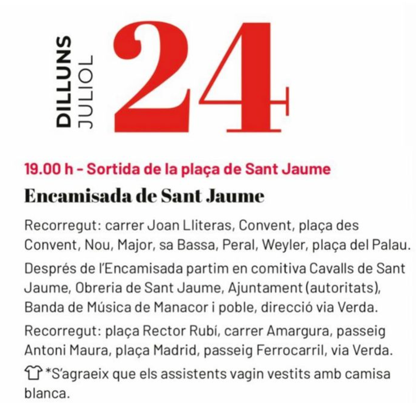 Dia 24 és el dia de l’Encamisada a Manacor i la Mulassa també participa a n’aquesta cercavila, surt de l’Ajuntament i fa tot el recorregut fins arribar a la plaça Rector Rubí.