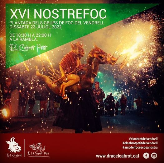 El pròxim dissabte 23 de juliol, tots els grups de foc del Vendrell es reuniran un any més per celebrar, conjuntament, el “Nostrefoc”. Enguany l’esdeveniment, que arribarà a la setzena edició, començarà a les 18.30 h a la Rambla del Vendrell amb una plantada de tots els grups de foc de la ciutat. Més tard, a les 20.30 h, actuaran totes les batucades mentre que, a les 22 h, es farà una encesa de lluïment de les diferents colles.