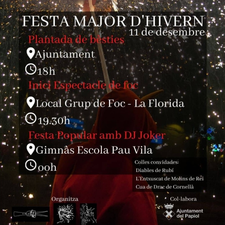 Amb motiu de la Festa Major d’hivern del Papiol, dissabte 11 de desembre es faran diferents activitats en les quals hi ha convidades les següents colles: Diables de Rubí, l’Entxuscat de Molins de Rei i els Cua de Drac de Cornellà.