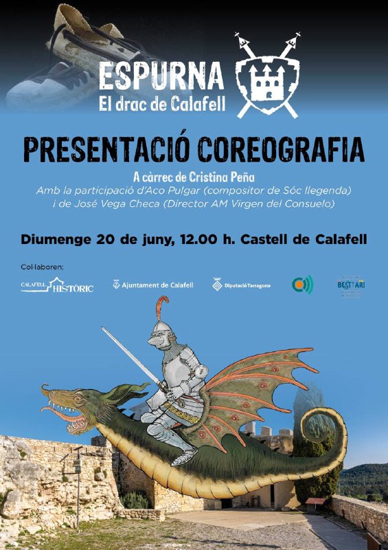 Diumenge 20 de juny, a les 12 h, tindrà lloc la presentació de la coreografia de la colla Espurna el Drac de Calafell. L’acte es farà al Castell del municipi, anirà a càrrec de Cristina Peña i comptarà amb la participació d’Aco Pulgar (compositor de la peça Sóc llegenda) i de José Vega Checa (Director AM Virgen del Consuelo).