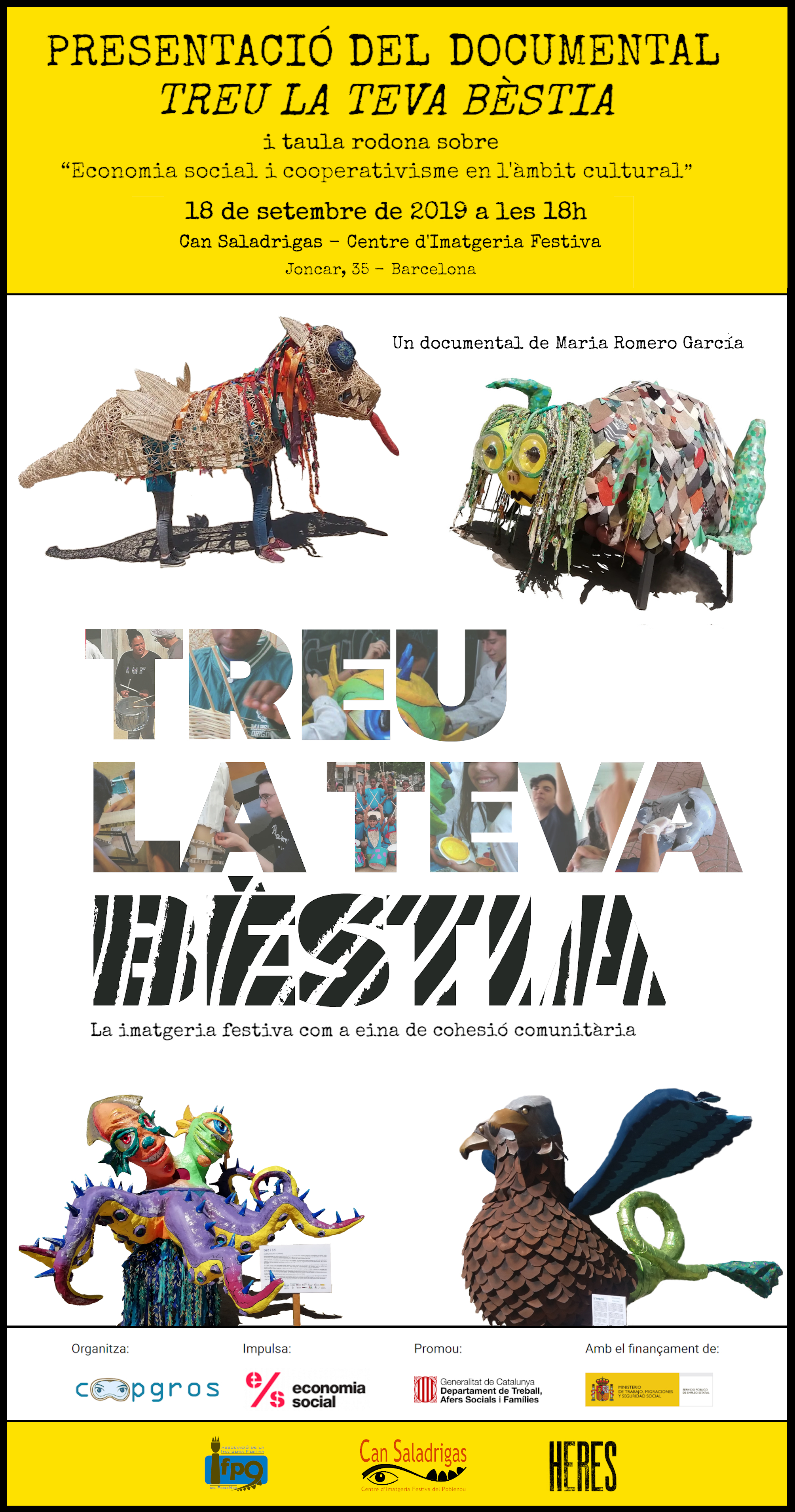 Tenim el goig de convidar-vos a la presentació del documental Treu la teva bèstia i a la taula rodona sobre “Economia social i cooperativisme en l’àmbit cultural” que tindrà lloc el proper dimecres 18 de setembre a les 18h a Can Saladrigas (c/Joncar, 35 – Barcelona).