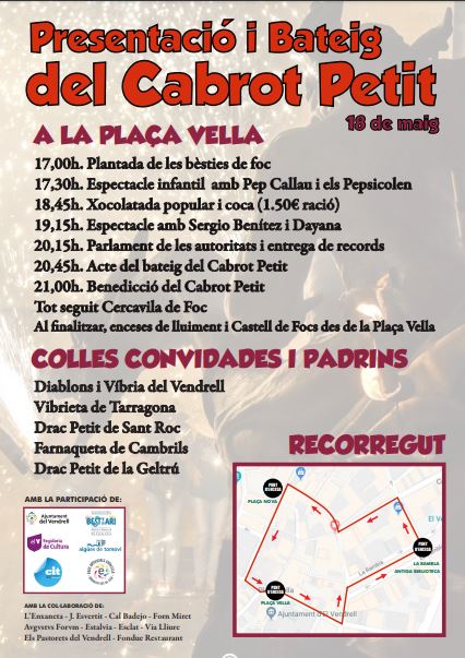 El proper Dissabte dia 18 de Maig a la Plaça Vella del Vendrell, a partir de les 17:00h tindrà lloc l’acte del Bateig del Cabrot Petit, el nou Drac infantil del Cabrot del Vendrell.