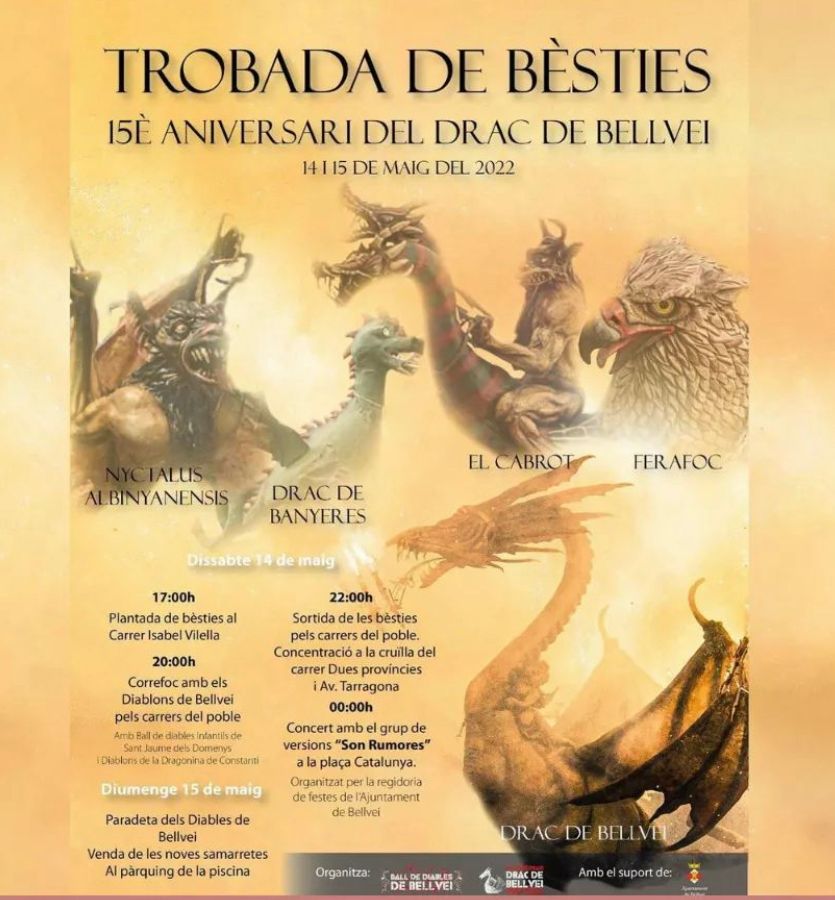 El cap de setmana del 14 i 15 de maig, el Drac de Bellvei celebrarà el seu 15è aniversari i ho farà acompanyat de quatre bèsties més: el Nyctalus Albinyanensis, el Drac de Banyeres del Penedès, el Cabrot del Vendrell i el Ferafoc de Sant Quintí de Mediona.
