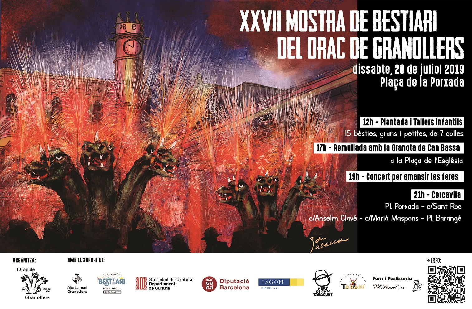 El 20 de juliol, des del migdia i fins a dos quarts de nou del vespre, quan comença la cercavila de foc, trobareu totes aquestes bèsties plantades a La Porxada. A més a més, també hi haurà activitats durant tota la jornada adreçades a petits i grans. Mireu el programa d’actes i detalls de les bèsties i podreu gaudir d’aquesta XXVII Mostra de Bestiari de Granollers.